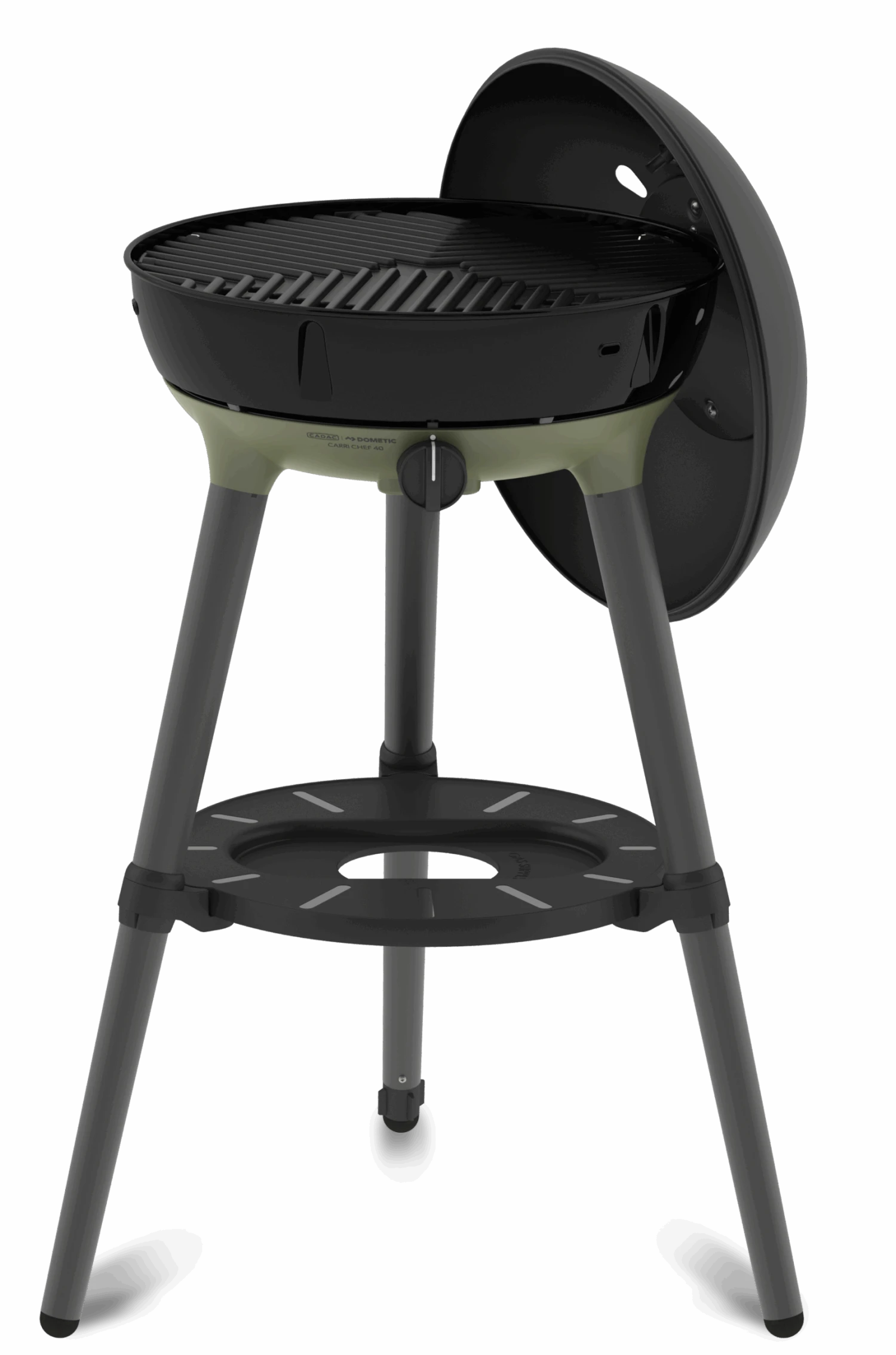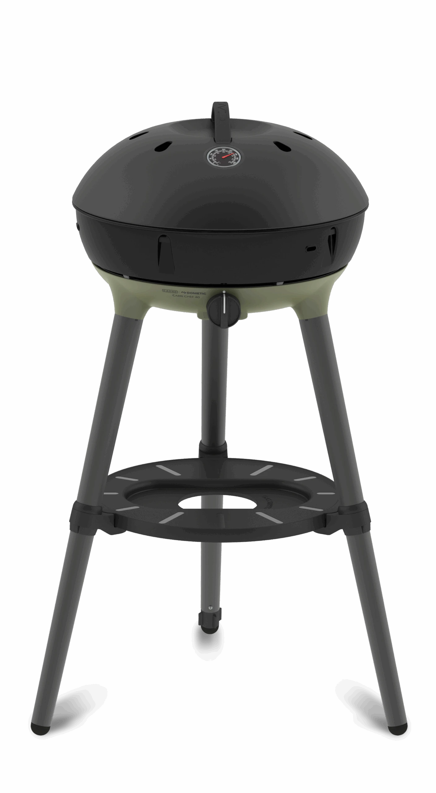 The dome lid, with stay-cool handle and thermometer, hooks onto the side of the BBQ to act as a windshield, and the utility shelf provides safe seating of the Cadac Power Pak gas supply.